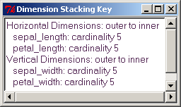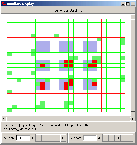 Cascade - Display Mode:Function:Change the current display mode of the main window. Operation:Click the display mode you want in the cascade. Details of each display mode can be found in the "Term Explanation" in the Help Dialog. Tips:You can view two different display modes at the same time by using the Auxiliary Display from the "View" menu. Back to topCommand - Auxiliary Display:Function:Raise the Auxiliary Display Dialog so that you can view two different display modes at the same time (one in the main window, the other in the Auxiliary Display Dialog). Operation:Click the "Select a Display" button in the top of the Auxiliary Display Dialog to raise a cascade. Click a display mode you want from the cascade. For example, select the "dimensional stacking" mode, and the display will be: