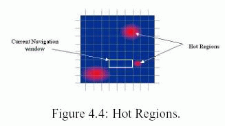 Focus StrategyStrategy S3 (focus) uses information about the most probable next direction (by keeping track of user’s previous movement) as well as hints about regions of high interest (hot regions, as depicted in Figure 4.4) in the data space as identified based on prior navigations of this same data by other users. We found the hot regions for each user by keeping the statistics of the regions visited by the user during the past explorations, and then maintaining all the regions that have frequency of visits above a particular threshold as hot regions. This strategy will continue to prefetch data in the given direction using the above mentioned direction heuristics. However, when a hot region is around the current navigation window, the prefetcher switches from the default direction prefetching to prefetch in that now more desirable direction. The hypothesis is that the user will likely stop at such a region of interest to explore those hot regions only if she got close enough to notice it.