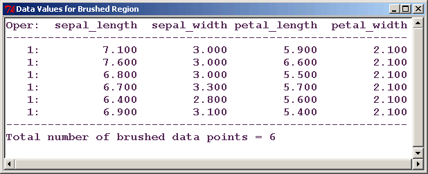 Tips:You can save the brushed data into a new data set for recording an interesting pattern or for further exploration of a subset of a data data. Back to topCommand - Save Brushed Data:Function:Save the brushed data as a new data set in the okc format. Operation:Input the name of the new data set into the standard Save As dialog. then click the Save button.