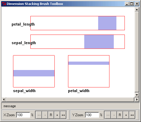 Back to topCommand - Flat Dimensional Stacking Brush Toolbox:Function:Raise the Flat Parallel Coordinates Brush Toolbox. You can change the flat brushes in this toolbox in the form of dimensional stacking by right mouse clicking or dragging and dropping. Operation: