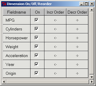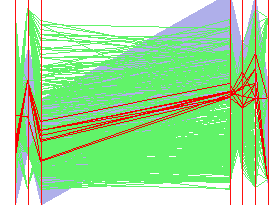You can select the "Wide Axes" button if you are in the (flat or hierarchical) Parallel Coordinates or (flat or hierarchical) Scatterplot Matrices mode. With this button selected, if you are in the Parallel Coordinates mode, the axis width of a representative dimension is proportional to the GDOD of the dimension cluster it represents. A wider axis represents a dimension cluster with a larger GDOD. In the flat scatterplot matrices, GDOD is mapped to the width of the frames of the plots.