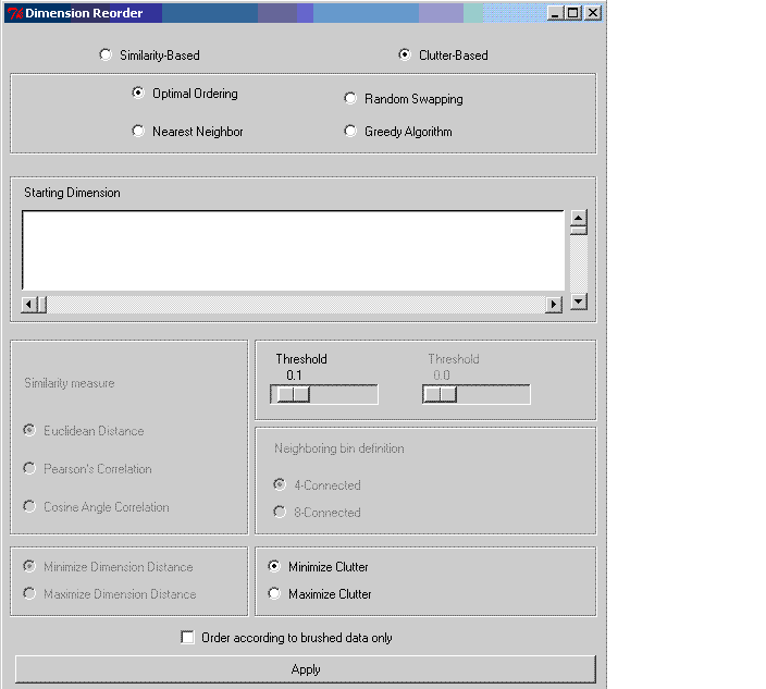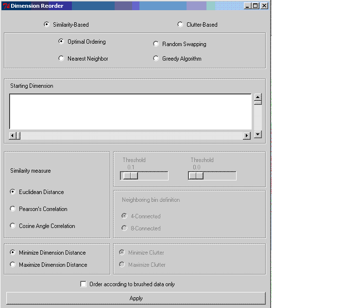 Back to topCommand - Automated Dimension ReorderingFunction: Various parameters and thresholds can be set by the user to better control the reordering process. Dimension reordering dialog box allows you to set the parameters for reordering dimensions according to two criteria: dimension similarities or visual clutter. Operations: In this Dimension Reorder dialog box, the user should first specify whether to reorder the dimensions using a similarity measure or a clutter measure. 1) Similarity-Based Dimension Reordering Parameters Each similarity measure reveals dimension relationships in a different way.