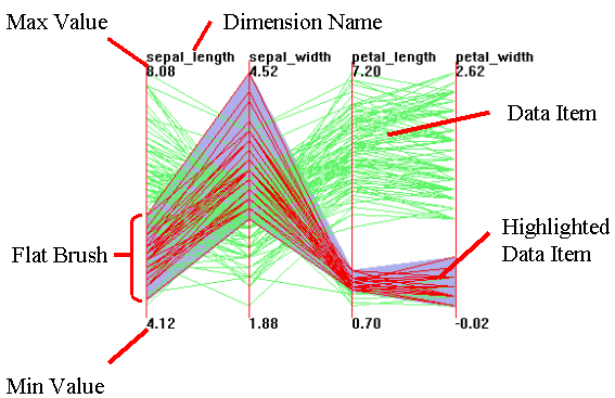 are covered by the operation if they evaluate to TRUE for this expression. Command - Brush Data Value Dialog for Flat Displays:Function:Raise the Data Value Dialog. You can see the brushed data values of the flat displays in this dialog.. Back to topCommand - Flat Parallel Coordinates Brush Toolbox:Function:Raise the Flat Glyphs Brush Toolbox so that you can change the flat brushes in this toolbox in the form of parallel coordinates. Operation: