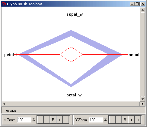 You can select the "Mean Band" button if you are in the flat Parallel Coordinates mode. A band is added to each data point ranging in width from the minimum to the maximum for each representative dimension. You can reduce the overlaps using the "Band Extent Scaling" scroll bar in the Dimension Reduction dialog. Options->Axis Color:You can select Uniform Color or Node Color for the lower dimensional space display. If you choose Uniform Color, then all the axes in the lower dimensional space display will be the system "Grid1" color. If you choose Node Color, the axes in the lower dimensional space display will be the same colors of their corresponding nodes in the dimension hierarchy shown in the InterRing display. Options->Circular Distortion:To choose from the Non-Pin or Pin mode when perform the circular distortion. Options->Visual Feedbacks:To enable/disable circular distortion feedback, roll up/drill down feedback, and show/hide selected nodes' name. Options->Selection Mode:To choose from the selecting according to Entries mode or the according to Radius mode.. Options->SBBrushing Mode:To switch the structure-based brushing mode between "cover all leaves" and "leaves only and filter out similar leaves". In the "cover all leaves" mode, for each leaf node in the sub-branch that has been applied structure-based brushing, either itself, or one of its ascendant will be selected. While in the other mode, only leaf nodes will be selected. If there are several leaves that are similar to each other according to the dissimilarity threshold, only one of them will be selected. Unimportant leaves will also be filtered out. Options->Reordering:To reorder the dimension hierarchy according to their importance... Options->Dimension Spacing:If dimension spacing is on, after the "apply" button is pressed, the dimensions in the Paralle Coordinates and Star Glyphs displays will be placed according to the similarities between adjacent dimensions. The more similar two adjacent dimensions are, the more close they are to each other. Reset ->Color Reset:To reassign colors to all nodes of the dimension hierarchy according to the current tree structure. It can be used after you modify the hierarchy. Reset->Circular Distortion Reset:To reassign sweeping angles to all nodes of the dimension hierarchy according to the current tree structure. Reset->Radial Distortion Reset:To reassign radius to all levels of the dimension hierarchy according to the current tree structure. Reset->Selection Reset:To unselect all the currently selected nodes. Reset->Apply Reset:To return to the original high dimensional space. Back to topMessage Bar:Message bar gives you many useful "how to do" and "what's it" hints. |