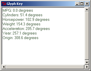 To zoom in the display in X direction, either click the + or ++ button after the X Zoom label. To zoom out the display in X direction, either click the - or -- button after the X Zoom label. To reset the display in X direction, click the R button after the X Zoom label. You can also directly input the zoom factor into the entry after the X Zoom label followed by pressing “enter” key. When the display is X zoomed in, you can move the focus of the display by dragging and dropping the horizontal scrolling bar around the display.. Zooming in Y direction is similar to zooming in X direction. X Zoom and Y zoom are independent form each other. Tips:1. ++ leads a larger increase than + does. - - leads a larger decrease than -. 2. Many dialogs contain displays. Usually they contain similar zoom entries as the zoom entries in the toolbar. You can zoom those displays in the same way using their zoom entries. Back to topCommand - Glyph Key:Function:Raise the Glyph Key Dialog to provide you the dimension information for the Glyphs display. Example:When the Glyph shape is Star Glyph, the Glyph Key Dialog will give information about each dimension (dimension name and angle degree in the star glyphs).