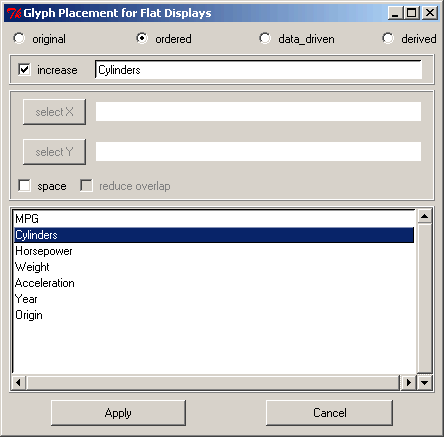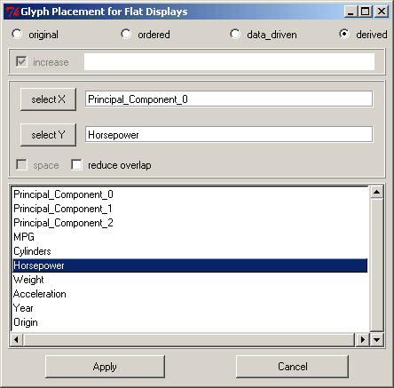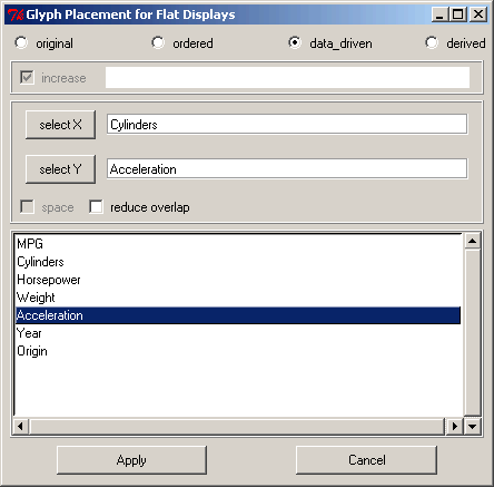 Command - Dimension Reduction:Function:Raise the Dimension Reduction Dialog so that you can reduce the dimensionality of the display using the Visual Hierarchical Dimension Reduction (VHDR). Please refer to the help page of Dimension Reduction. Back to topCommand - Data Summary & Statistics:Function:Raise the Data Summary & Statistics Dialog to provide you the data summary and statistics information of the current data set. Back to topCommand - Glyph Customization:Function:Raise the Glyph Placement for Flat Display Dialog. You can change the glyph placement mode for flat displays. Operation:There are four different glyph placement modes in XmdvTool: