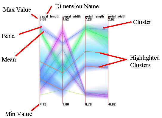 Coordinates mode, two extra axes are displayed around a representative dimension to indicate the minimum and maximum of the corresponding dimension cluster for every data point.