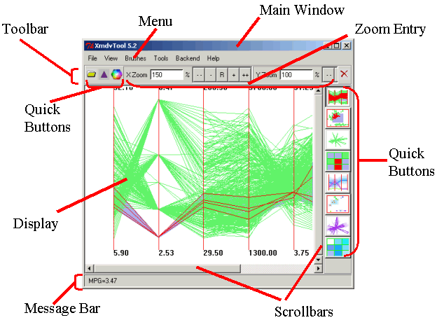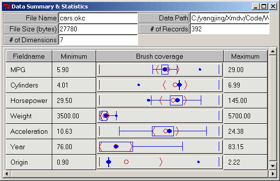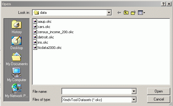 Automatic clustering function:In previous versions of XmdvTool, you have to generate a data hierarchy yourself if you want to view the data set in a multi-resolution manner. Now you no longer need to do that. The system will automatically generate the cluster file in binary format for you if you have not provided one. If you want to generate your own cluster file, you will have to use a translation tool referred on the xmdv web page, for converting from .okc to .cg/.cf: http://davis.wpi.edu/~xmdv/downloadtools.html
