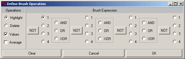 the brush. XmdvTool supports four types of brush Highlight -- This operation causes all the points covered by the brush to be displayed in a different color. When this operation is active, the color will be available in the Color Requester . Mask -- This operation causes all points covered by the brush to be hidden from the display. This is useful when the display is cluttered and it is necessary to remove some data to view other interesting data. Values -- This operation causes the numeric value of all points covered by the brush to be displayed in a separate popup window. This window can be opened from the main interface by selecting Data Values. Average -- This operations causes the average value of all points currently selected by the brush to be displayed in each of the display views. In addition, if the Values operation is also selected, the numeric average is added to the end of the values in the data values window. Brush Expression The brush expression is a logical expression between brushes. Points