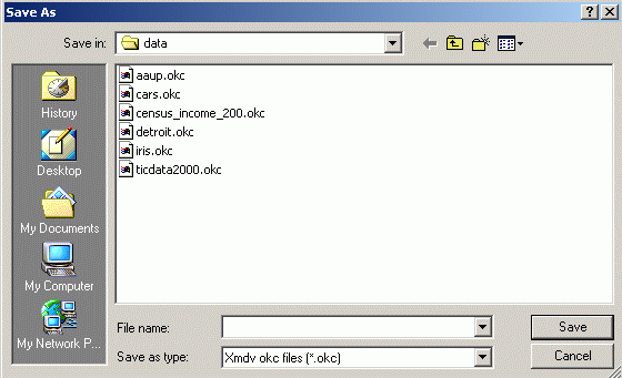Tools for converting to .okc format: http://davis.wpi.edu/~xmdv/downloadtools.html Back to topCommand - Close:Function:Close the current data set. Back to topCommand - Save Image:Function:Save the current display in the main window as an image in the ppm format. Operation:Input the image file name into the standard Save As dialog, then click the Save button.