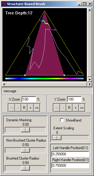 Place the cursor between the left and right handle. Drag and drop the cursor to a new position. c. Show/hide bandsCheck/uncheck the "ShowBand" check button to show or hide bands of the clusters in the hierarchical displays. d. Extent ScalingDrag and drop the scaling bar under the label of "Extent Scaling" change the size of the bands to reduce overlap in the hierarchical displays. When the value is 0, the bands are of the original sizes. Otherwise the bands have been decreased. e. Dynamic MaskingDrag and drop the scaling bar under the label of "Dynamic Masking" to fake the brushed clusters or the non-brushed clusters in the hierarchical displays. When the value is 0, no clusters are faked. When it is negative, the brushed clusters are faked. When it is positive, the non-brushed clusters are faked. Back to topCascade - Structure-Based Brush Semantics:Function:Change the semantics of the structure-based brush.