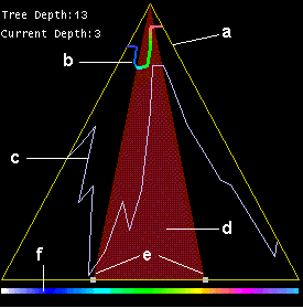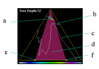 a: brushed cluster radius b: non-brushed cluster radius c: hierarchy contour d: brushed region e: left handle f: right handle Operation:a. Change cluster radius